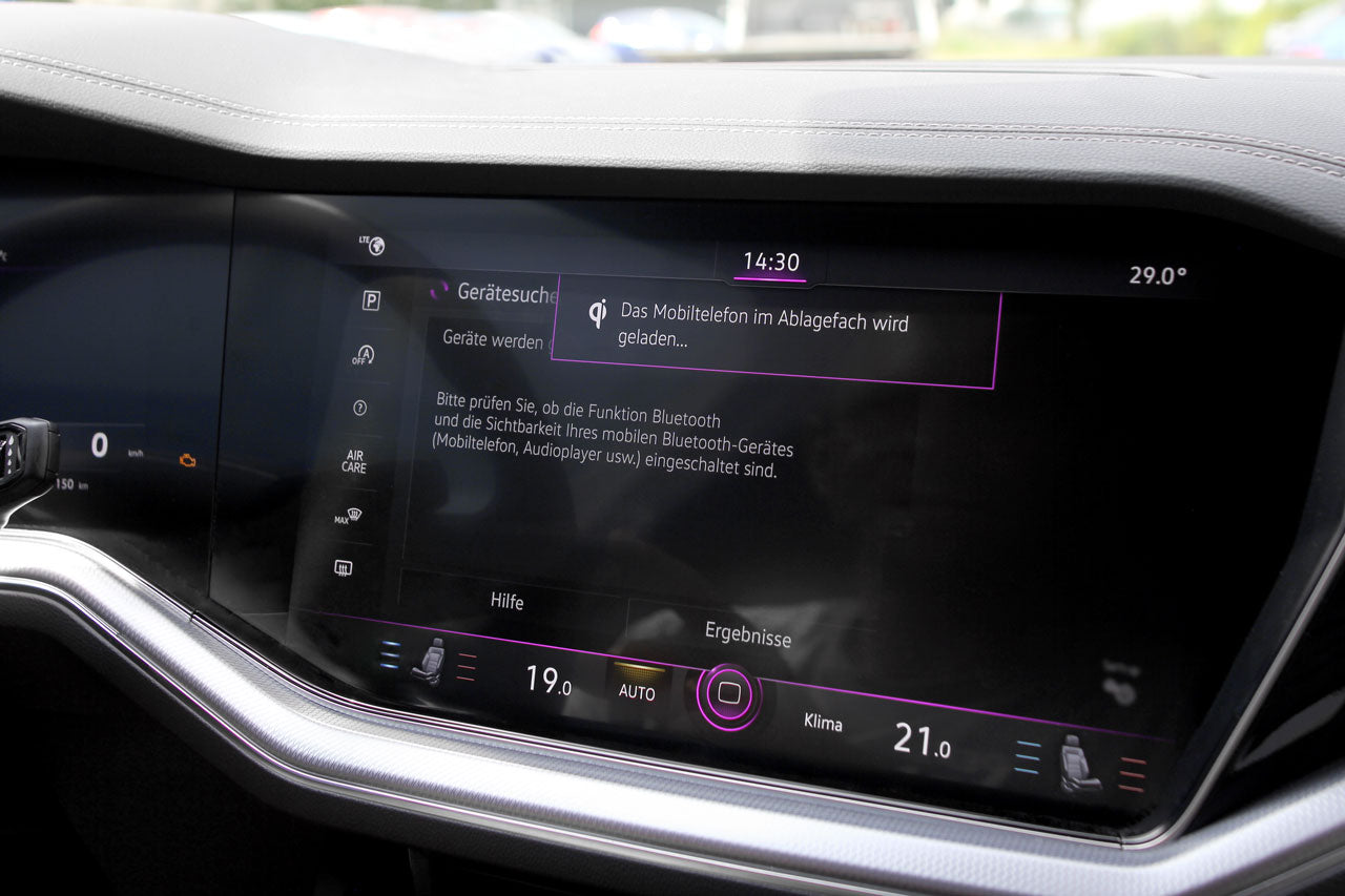 Retrofit kit of the VW phone box for an original Bluetooth interface for the VW Touareg CRThis set is suitable for vehicles with the factory-installed mobile phone preparation (PR No. 9ZX)The universal mobile phone rest near the center armrest (front) allows charging your mobile phone via wireless charging (Qi standard)The inductive coupling antenna connects the mobile phone to the outside antennaLower radiation in the interior as well as optimum reception quality"Forgotten warning" when leaving the vehicle if the mobile phone is still in the phone boxCharge level indicator in the radio / navigation systemEasy installation due to tailor-made cable assemblyThe SIM card slot of the main unit can be used for phone callsScope of Delivery:cable setcompenser + holderantenna cablescoupling antennasmall partsoutside aerialcoding dongleNote:Only for vehicles with mobile phone preparation (PR no .: 9ZX)Wireless Charing (QI standard) must be supported by the mobile phone