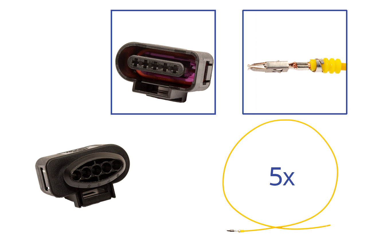 5-pin plug housing for spare parts and repairsConnector OE number: 1J0 973 705There are 3 different options available:Connector / plugOnly the pure connector is supplied hereConnector / plug + contact materialHere we deliver the connector and the required contact materialFor automotive cables FLRY 0.5mm² - 1.0mm²Fully assembled connector / plugCable length: 600mm0.5mm² / 1.0mm² FLRY vehicle cables with reduced wall thickness and high concentricity according to the standards ISO 6722, DIN 72551, LV 112Assembled single cable similar to 000 979 019 E (0.5mm²) 000 979 131 E (1.0mm²)Produced on fully automatic machines with crimp force monitoring (process monitoring)Approved for the automotive sector (temperature range from -40 ° C to 105 ° C)Cables comply with the EU directive for end-of-life vehicles 2000/53 / EG (EU end-of-life vehicle regulation)Selectable options:Connector only (5-pin plug housing 1J0 973 705)Connector + contact material (5-pin plug housing 1J0 973 705 + 5x contacts + 5x seal and 3x blind seal)Assembled repair kit (5-pin plug housing 1J0 973 705 with fully crimped connecting cables) 0.5mm²Assembled repair kit (5-pin plug housing 1J0 973 705 with fully crimped connecting cables) 1.0mm²Note:To ensure proper function and tightness, make sure that the cable diameter and cross-section are correctThe original spare part number / OE number is for comparison purposes only