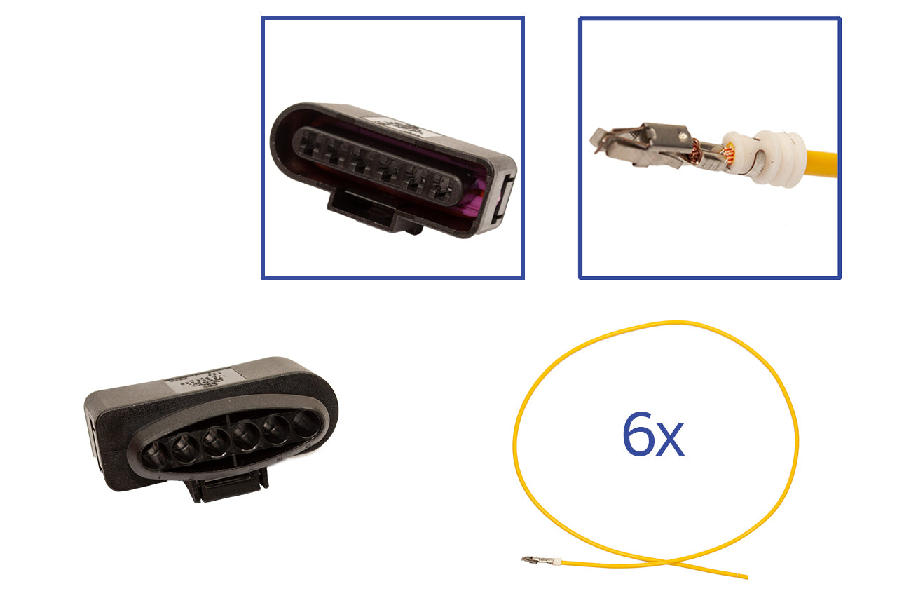 6-pin plug housing for spare parts and repairsConnector OE number: 1J0 973 726There are 3 different options available:Connector / plugOnly the pure connector is supplied hereConnector / plug + contact materialHere we deliver the connector and the required contact materialFor automotive cables FLRY 0.5mm² - 1.0mm² / 1.5mm² - 2.5mm²Fully assembled connector / plugCable length: 600mm0.5mm² / 1.0mm² / 2.5mm² FLRY vehicle cables with reduced wall thickness and high concentricity according to the standards ISO 6722, DIN 72551, LV 112Assembled single cable similar to 000 979 225 E (0.5mm²) 000 979 133 E (1.0mm²) 000 979 225 E (2.5mm²)Produced on fully automatic machines with crimp force monitoring (process monitoring)Approved for the automotive sector (temperature range from -40 ° C to 105 ° C)Cables comply with the EU directive for end-of-life vehicles 2000/53 / EG (EU end-of-life vehicle regulation)Selectable options:Connector only (6-pin plug housing 1J0 973 726)Connector + contact material (6-pin plug housing 1J0 973 726 + 6x contacts + 6x seal and 3x blind seal) 0.5mm² - 1.0mm²Connector + contact material (6-pin plug housing 1J0 973 726 + 6x contacts + 6x seal and 3x blind seal) 1.5mm² - 2.5mm²Assembled repair kit (6-pin plug housing 1J0 973 726 with fully crimped connecting cables) 0.5mm²Assembled repair kit (6-pin plug housing 1J0 973 726 with fully crimped connecting cables) 1.0mm²Assembled repair kit (6-pin plug housing 1J0 973 726 with fully crimped connecting cables) 2.5mm²Note:To ensure proper function and tightness, make sure that the cable diameter and cross-section are correctThe original spare part number / OE number is for comparison purposes only