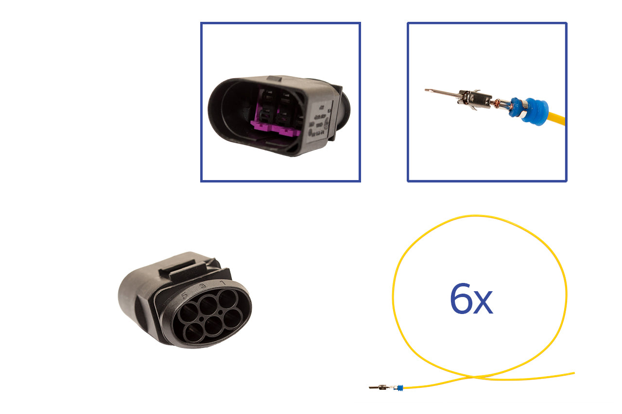 6-flatpin housing for spare parts and repairsConnector OE number: 1J0 973 833There are 3 different options available:Connector / plugOnly the pure connector is supplied hereConnector / plug + contact materialHere we deliver the connector and the required contact materialFor automotive cables FLRY 0.5mm² - 1.0mm² / 1.5mm² - 2.5mm²Fully assembled connector / plugCable length: 600mm0.5mm² / 1.0mm² / 2.5mm² FLRY vehicle cables with reduced wall thickness and high concentricity according to the standards ISO 6722, DIN 72551, LV 112Assembled single cable similar to 000 979 022 E (0.5mm²) 000 979 134 E (1.0mm²) 000 979 226 E (2.5mm²)Produced on fully automatic machines with crimp force monitoring (process monitoring)Approved for the automotive sector (temperature range from -40 ° C to 105 ° C)Cables comply with the EU directive for end-of-life vehicles 2000/53 / EG (EU end-of-life vehicle regulation)Selectable options:Connector only (6-flatpin housing 1J0 973 833)Connector + contact material (6-flatpin housing 1J0 973 833 + 6x contacts + 6x seal and 3x blind seal) 0.5mm² - 1.0mm²Connector + contact material (6-flatpin housing 1J0 973 833 + 6x contacts + 6x seal and 3x blind seal) 1.5mm² - 2.5mm²Assembled repair kit (6-flatpin housing 1J0 973 833 with fully crimped connecting cables) 0.5mm²Assembled repair kit (6-flatpin housing 1J0 973 833 with fully crimped connecting cables) 1.0mm²Assembled repair kit (6-flatpin housing 1J0 973 833 with fully crimped connecting cables) 2.5mm²Note:To ensure proper function and tightness, make sure that the cable diameter and cross-section are correctThe original spare part number / OE number is for comparison purposes only