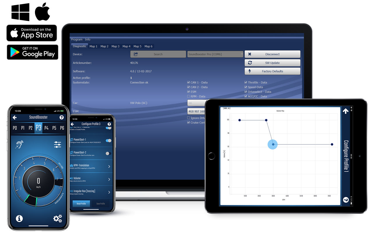 The KUFATEC Sound Booster Intensify Boost significantly enhances the sound of your ex-factory Active Sound sound generatorA powerful V6 / V8 sound at the push of a button (depending on the configuration)You can choose between 6 sound profiles yourself or switch off the systemProfile 1 provides a very discreet sound for noise sensitive areasPlug & Play installationControl and profile settings:you can choose between up to 6 profileschange sound profiles with: the standard integrated push buttonoptional remote controlcar integrated control possibilities, e.g. cruise controlthe mobile app "KUFATEC Link"We recommend installing the button in the front area (eg glove box); but this does not necessarily have to be installedAdaptation of profiles, maps and sound via free software or via the free appyou decide (e.g. via the Drive Select menu) whether the module should act as active or passive"Power-Start" - When the engine is started, the exhaust system howls briefly (this function can be switched on or off via Drive Select in the MMI, the software or the app)Suitable for:Audi S6 C8 4A from model year 2020257 KW / 349 PSAudi S7 C8 4K from model year 2020257 KW / 349 PSFunction of the "Kufatec Link" Smartphone App:General diagnostics with CAN packet counterpin protectionIncognito mode (the module is completely invisible after the set time)Software Updates Over The AirFactory resetVisualization of the following informationengine speedaccelerator pedal positionactual vehicle speedSound Booster specific FeaturesVehicle selectionESM Selection (sound control unit)Comfort profile selector (if supported by the vehicle)Simulation mode (virtual accelerator)Edit sound profiles (RPM, volume, tracing irregular run, Irregular load, gala, accelerator, power start)Activate / deactivate sound profilesScope of delivery:Sound Booster Pro (Module)Plug & Play cable setNotes:This product is not permitted for use on public roads - use only for racing purposes.only for cars with Active Sound generator ex-works