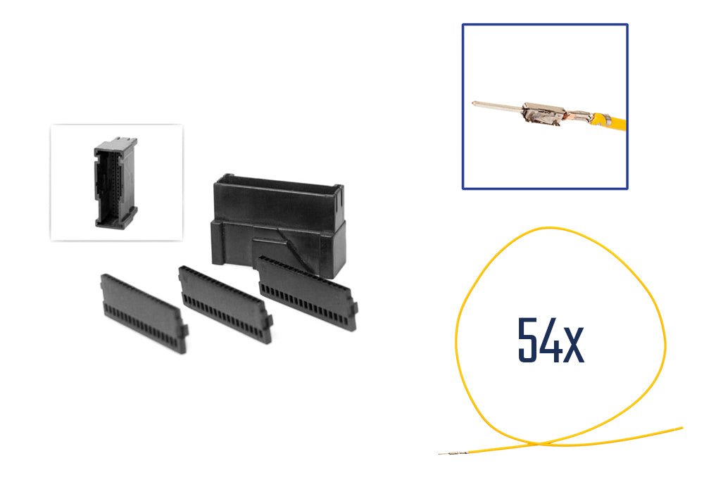 KUFATEC mating connector for retrofitting and repair work for VW, Audi, BMWSuitable for factory connections on the telephone, TV54 pinThere are 3 different options available:Connector / plugOnly the pure connector is supplied hereConnector / plug + contact materialHere we deliver the connector and the required contact materialFor automotive cables FLRY 0.35mm² - 0.75mm²Fully assembled connector / plugCable length: 600mm0.5mm² / 0.75mm² FLRY vehicle cables with reduced wall thickness and high concentricity according to the standards ISO 6722, DIN 72551, LV 112Assembled single cable similar to 000 979 012 E (0.5mm²) 000 979 165 E (0.75mm²)Produced on fully automatic machines with crimp force monitoring (process monitoring)Approved for the automotive sector (temperature range from -40 ° C to 105 ° C)Cables comply with the EU directive for end-of-life vehicles 2000/53 / EG (EU end-of-life vehicle regulation)Selectable options:Connector only (Connector male 54 pin)Connector + contact material (Connector male 54 pin + 54x contacts and 3x inset)Assembled repair kit (Connector male 54 pin with fully crimped connecting cables) 0.5mm²Assembled repair kit (Connector male 54 pin with fully crimped connecting cables) 0.75mm²