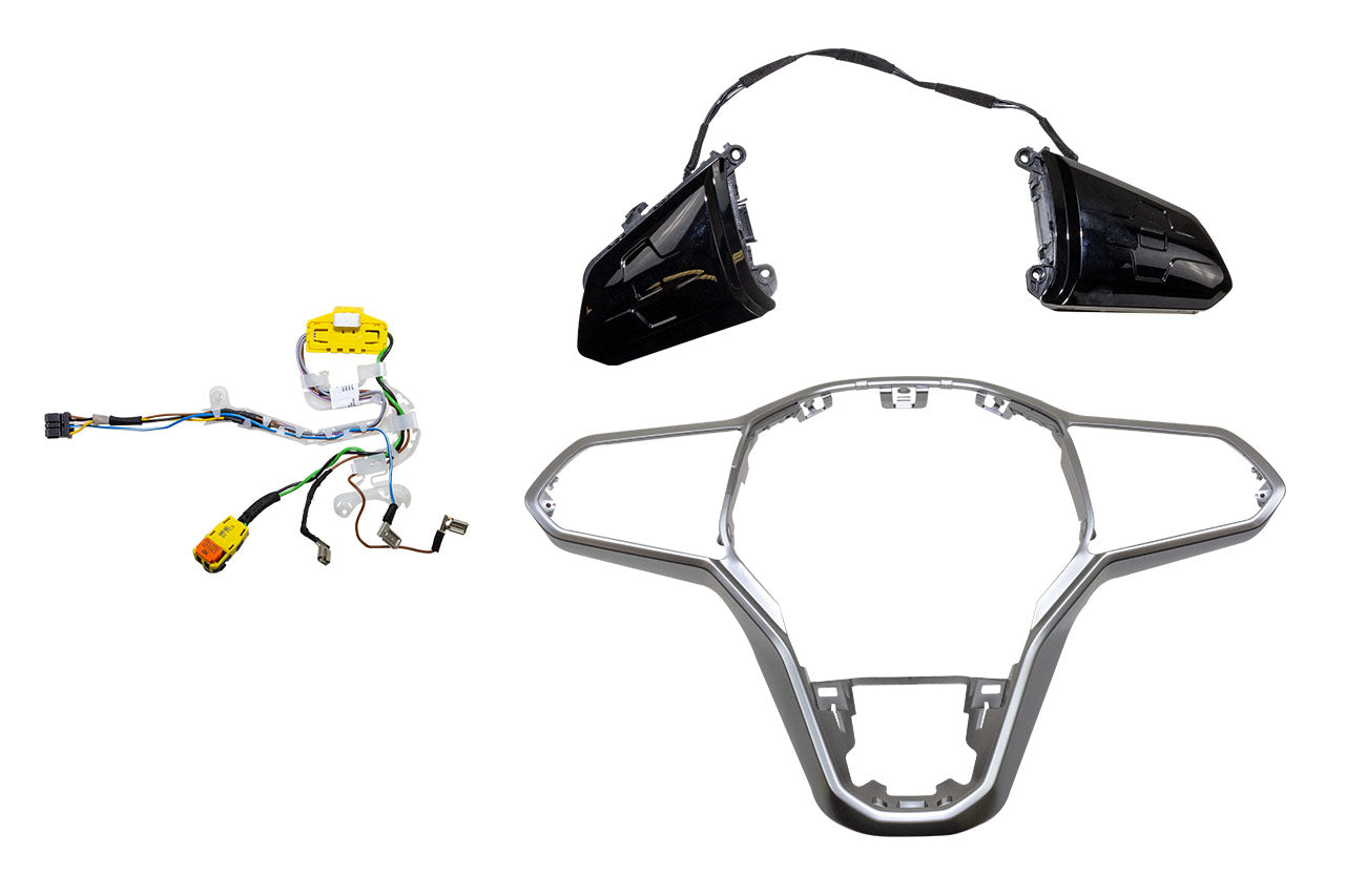 Complete set for retrofitting the original multifunctional buttons Touch (MFL) for VW T6.1 SHAll operating options of the factory installed MFL are retainedThe touch buttons offer the following highlights:modern look and feel, black glossyfaster operation especially volume infotainmentillumination of the buttons only after ignition on, without ignition "black optics"no more single buttons, therefore no penetration of impuritiesSelectable option:without ACC (PR-No.: 8T6)with ACC (PR-No.: 8T7, 8T8)Scope of delivery:VW Touch MFL buttonsCable setCoding dongleNotes:Only suitable for vehicles with multifunction steering wheel (PR-No.: 2FD)Vehicles without multifunction steering wheel (PR-No.: 1MM) on request