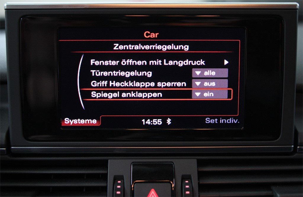 Retrofit electrically folding exterior mirrors for Audi A6 4G. Foldable with adjustment knob and fold-in function when closing with MMI