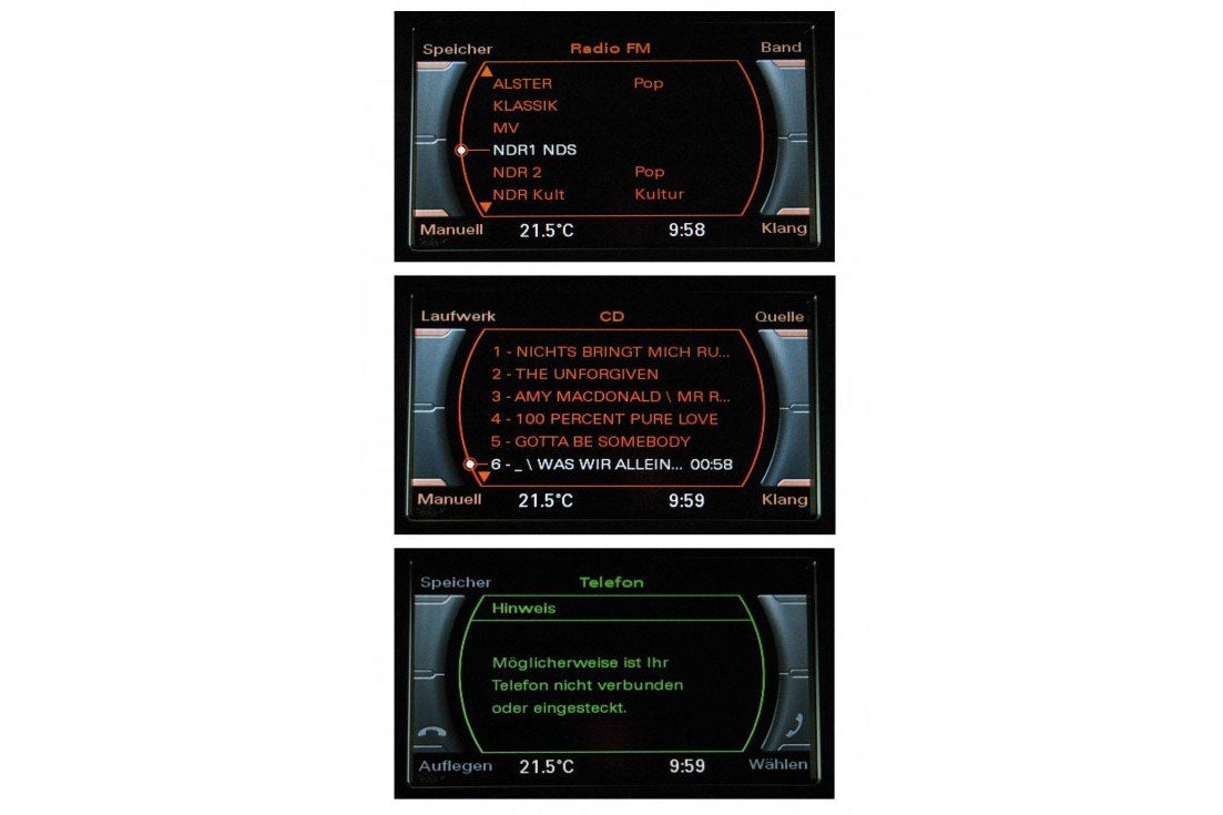 Specific kit in order to upgrade from factory system Radio Chorus to Radio Concert or Radio Symphonie in an Audi A5 8TAdvantages: Playing of mp3 as well as WMA filesRetrofitting of telephone hands free kits like FISCON "Basic Plus" possibleSelectable options:Radio Concert, until model year 2011Radio Concert, from model year 2012Radio Symphonie, until model year 2011Radio Symphonie, from model year 2012Scope of Delivery:Cable setRadiounitDisplayCover for displayRadio Concert:Complete integration into the infotainment systemColored screen 6,5"CD-DriveSD-slotRadio Symphonie:Complete integration into the infotainment systemColored screen 6,5"Integrated CD-Changer (6 CD's)SD-slotNote:The delivered hardware is coming from test vehicles. The components passed several operation checks. The hardware is equipped with the latest software versionYou are getting 24 months warranty on the items