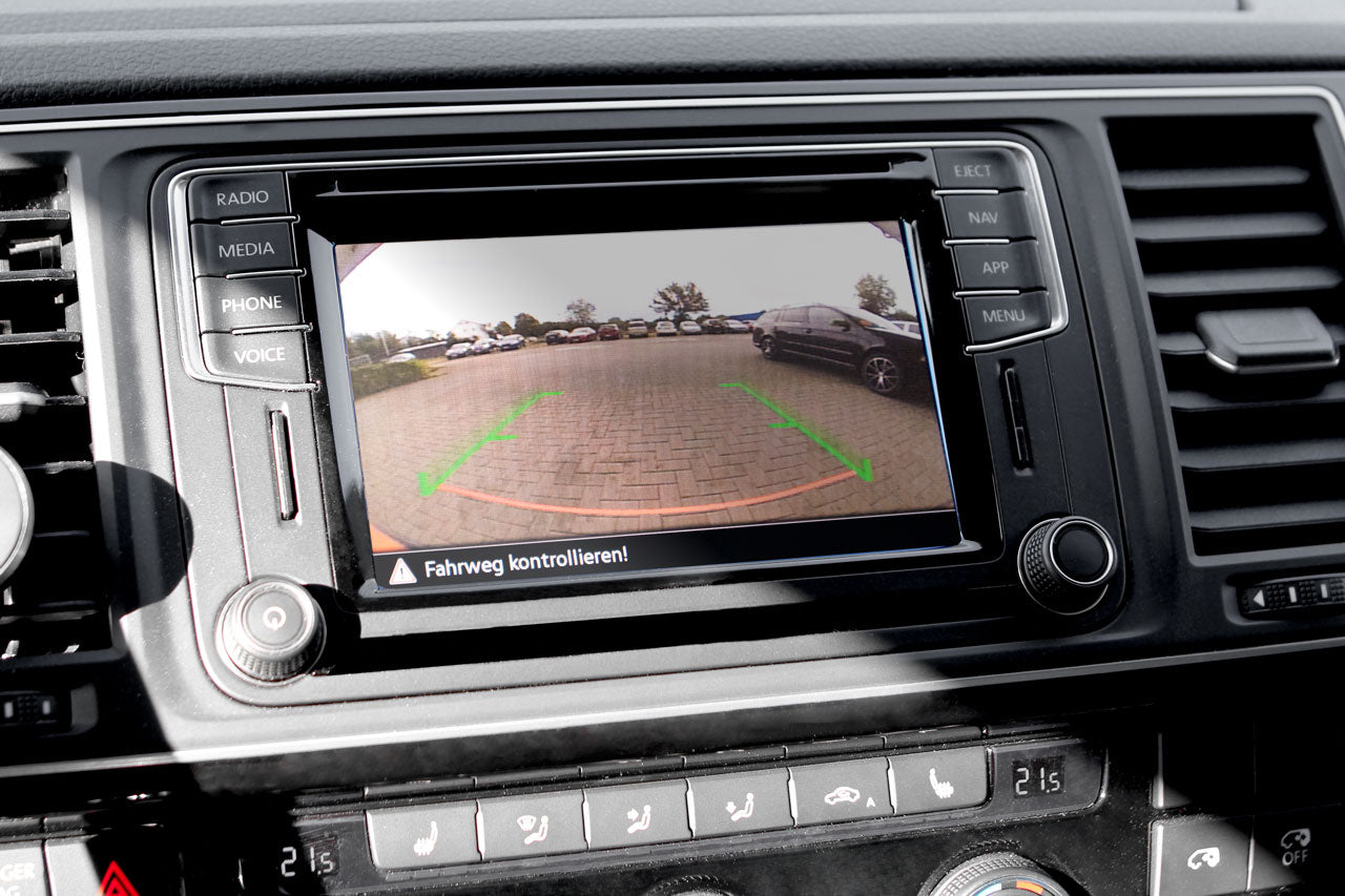 Complete set for the retrofit of a rearview camera VW T6 SGWide-angle view of the rear portionNo installation of original control unit or additional monitors!Automatic switching to rear camera in reverse gearExchange of views between PDC and rear camera possibleSelectable Option:Equipment: Tailgate (pr-no.: 3RB, 3RC, 3RP)vEquipment: Gullwing DoorsRequirement:Composition Media (PR-No.: I7A)Discover Media (PR-No.: 7UP)Scope of delivery:HarnessCamera with holderCodierdongleNote:With static auxiliary-line presentationThe guide lines are shown solid and do not move with steeringThe final coding is performed with the coding dongle included in the scope of delivery